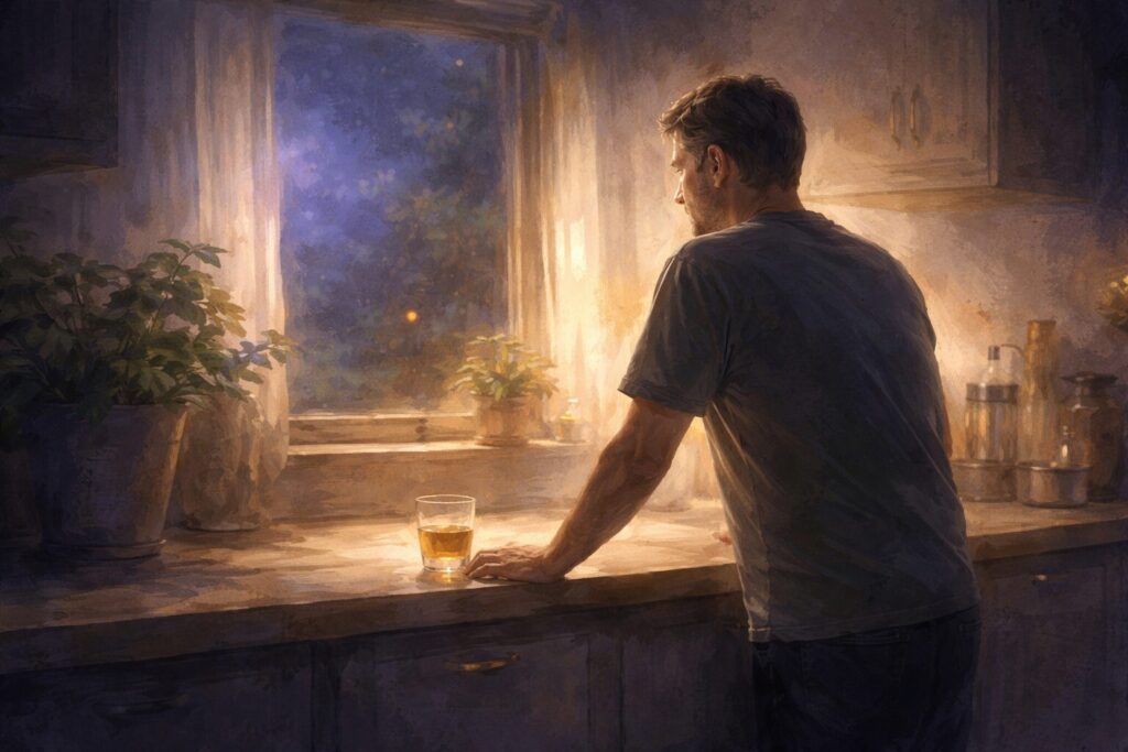 Een vader houdt zich aan een belofte die hij zijn kinderen deed. Niet uit dwang, maar uit liefde. Op een gewone januariavond, in de stilte van de keuken, wordt duidelijk dat stoppen met iets soms vooral betekent: leren luisteren. Een verhaal over rituelen, nabijheid en een glas dat bleef staan.